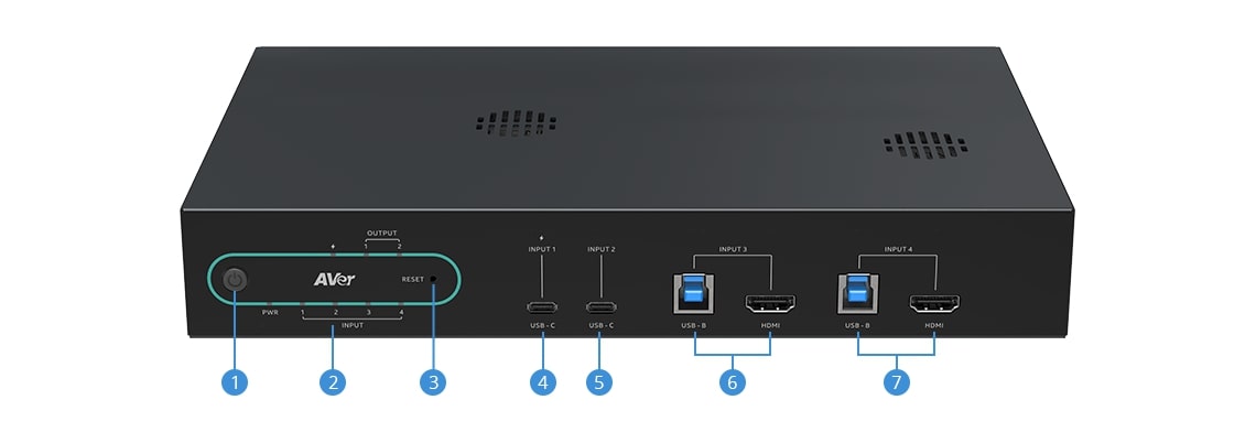 1 - Кнопка питания 2 - Светодиодные индикаторы 3 - Кнопка сброса 4 - Вход 1: USB Type-C 3.0 с поддержкой зарядки 5 - Вход 2: USB Type-C 3.0 6 - Вход 3: USB Type-B 3.2 Gen 1 / HDMI 7 - Вход 4: USB Type-B 3.2 Gen 1 / HDMI |