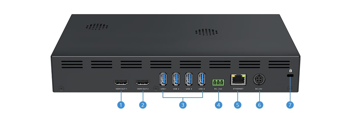 1 - HDMI Выход 1 2 - HDMI Выход 2 3 - USB Type-A 3.0 4 - RS-232 5 - RJ-45 6 - DC 24V 7 - Слот Kensington |
