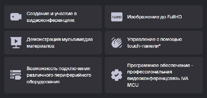IVA Room – это программно-аппаратный видеотерминал для переговорных комнат. В зависимости от комплектации периферийного оборудования IVA Room может подойти для переговорных комнат любого размера. | ![]() |