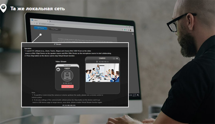 Виртуальная трансляция Наслаждайтесь простой в использовании виртуальной потоковой передачей. С помощью функции Room Management (только в версии для Windows® ) вы можете транслировать видео с камер AVer, находящихся в одной локальной сети. При использовании программного обеспечения для видеоконференций вы также можете включить эту функцию, чтобы активировать виртуальную трансляцию одним щелчком мыши. |