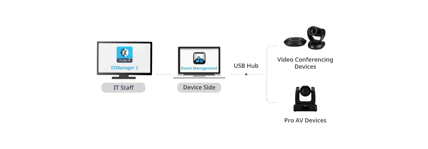 Чтобы упростить управление устройствами, вы можете связать Room Management с EZManager 2. Эта система классифицирует камеры AVer и наглядно отображает состояние каждого устройства, что упрощает управление сетью.